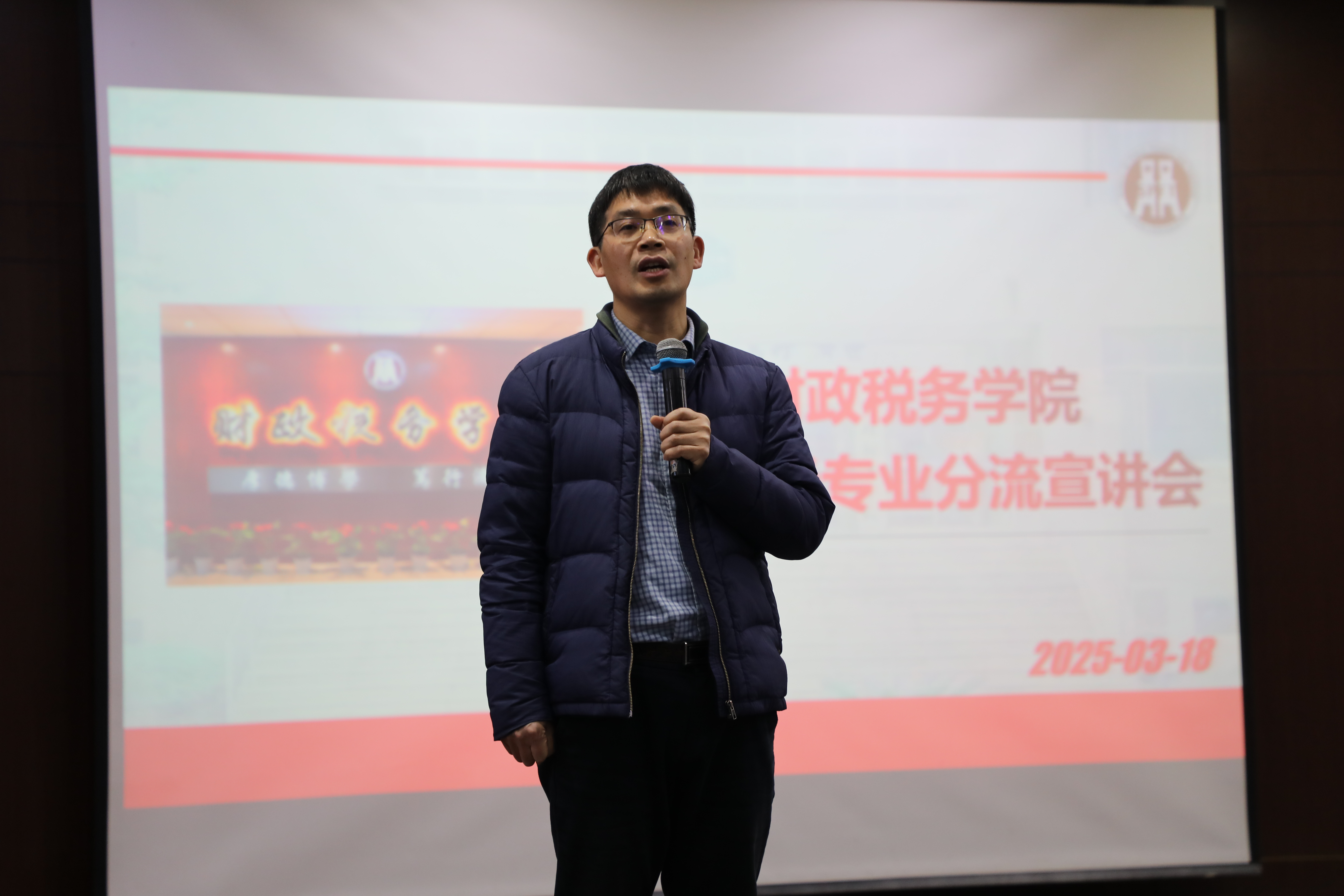 教学副院长张帆主持,财政系副主任王超、税务系主任田磊、副主任蒲龙和税务系教师郑家兴出席,2023级财政学类专业全体学生参会。
