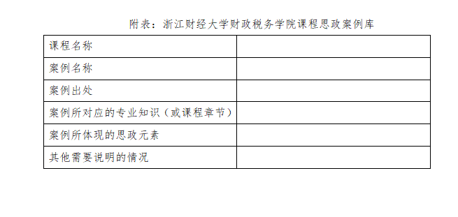 (二)启动教学案例收集、整理和分析工作。各门课程以案例为载体,将理论与实践相结合、将思政与专业相结合。每门课程中能够包含和体现思政元素的案例不少于3个(具体格式见附表)。学院定期将这些案例编辑成册,供全院师生教研所需。