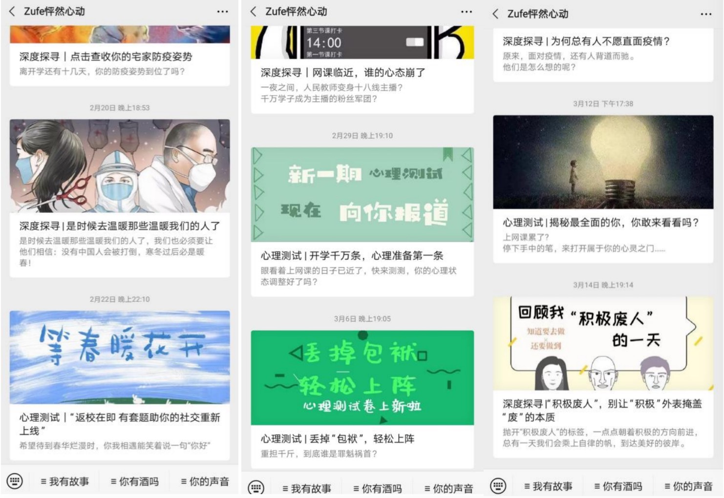 利用网络平台,辅导员们及时展开学生心理状况线上普查,排查重点区域学生,与其进行一对一联系,动态关注其居家期间的情绪状态,深入了解学生当前的各类诉求和困惑,并有针对性地开展心理疏导。此外,结合疫情的心理应激特点和师生需求,av大平台 通过微信公众号平台发布居家防护妙招、心理调适方法、各级心理援助资源等文章,为广大学生提供暖心的在线服务。