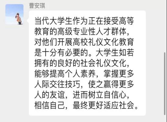 曹安琪同志说:“当代大学生作为正在接受高等教育的高级专业性人才群体,对他们开展高校礼仪文化教育是十分有必要的。大学生如若拥有的良好的社会礼仪文化,能够提高个人素养,掌握更多人际交往技巧,使之赢得更多人的友谊,进而树立自信心,相信自己,最终更好适应社会。”