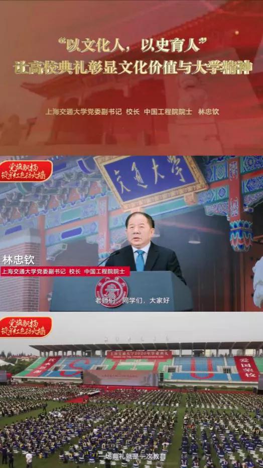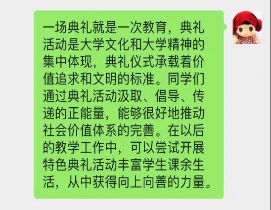 张朝阳同志说:“高校典礼活动有着表达情感、凝聚人心、传递文明和价值导向的作用,既能够提升学生们对集体的认同感和归属感,又能够将正确的价值理念和道德观念内化到学生的思维中。应强化典礼作为高校思想政治教育的载体功能,我们党员教师应积极地参与其中,并借助这一载体提高育人的能力。”