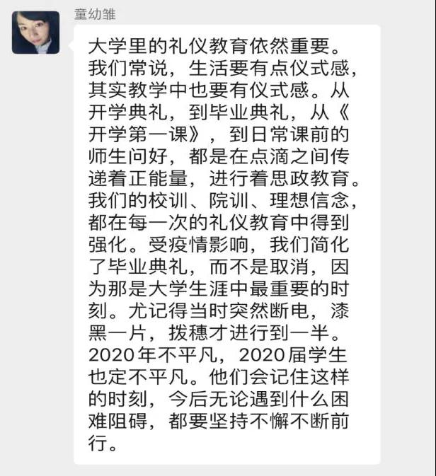 在学习了微党课后,支部成员在线上展开了热烈的讨论。童幼雏同志谈到:“大学里的礼仪教育依然重要。我们常说,生活要有点仪式感,其实教学中也要有仪式感。从开学典礼,到毕业典礼,从《开学第一课》,到日常课前的师生问好,都是在点滴之间传递着正能量,进行着思政教育。我们的校训、院训、理想信念,都在每一次的礼仪教育中得到强化。受疫情影响,我们简化了毕业典礼,而不是取消,因为那是大学生涯中最重要的时刻。尤记得当时突然断电,漆黑一片,拨穗才进行到一半。2020年不平凡,2020届学生也定不平凡。他们会记住这样的时刻,今后无论遇到什么困难阻碍,都要坚持不懈不断前行。”