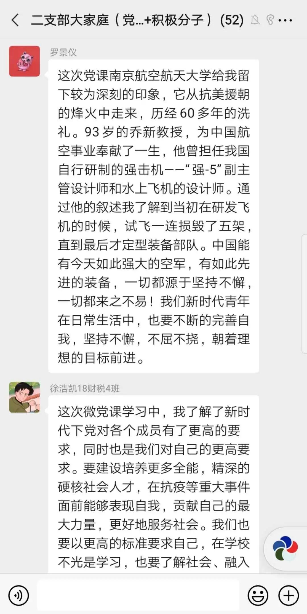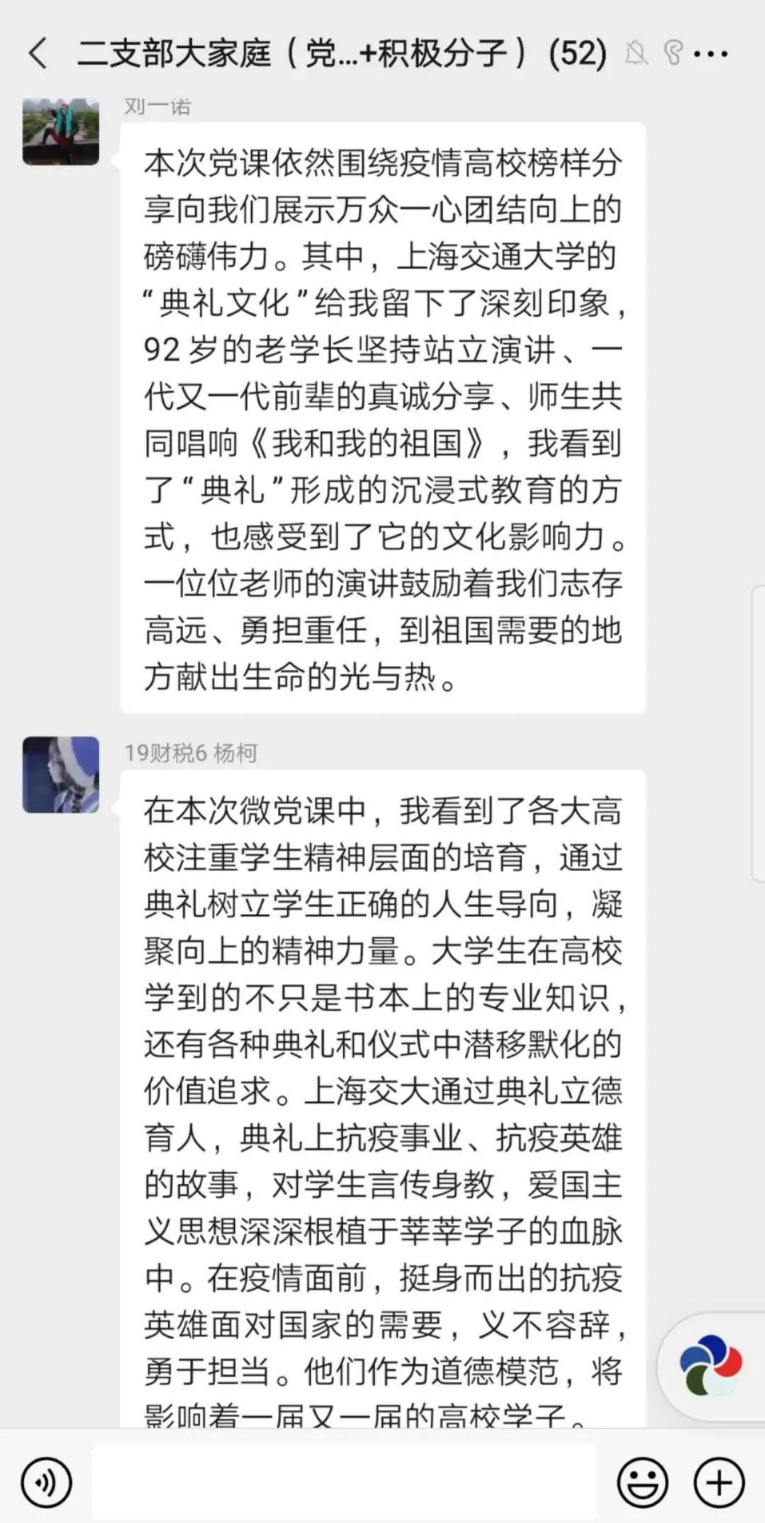 学生第二党支部组织观看学习高校党组织战“疫”示范微党课。本次微党课由上海交通大学林忠钦院士、北京理工大学张军院士、中国农业大学康绍忠院士、南京航空航天大学冯邵红党委书记等联合开讲。他们结合高校翔实生动的校史、校情向大家生动诠释了高校的发展始终与国家、民族命运紧密相连的奋斗历程,强调了坚持正确导向,强化典礼育人在新时代大学生中弘扬爱国主义精神的重要意义。