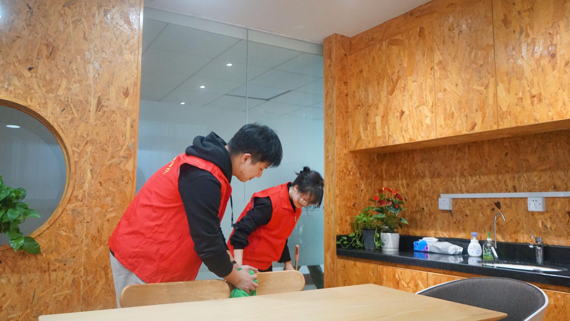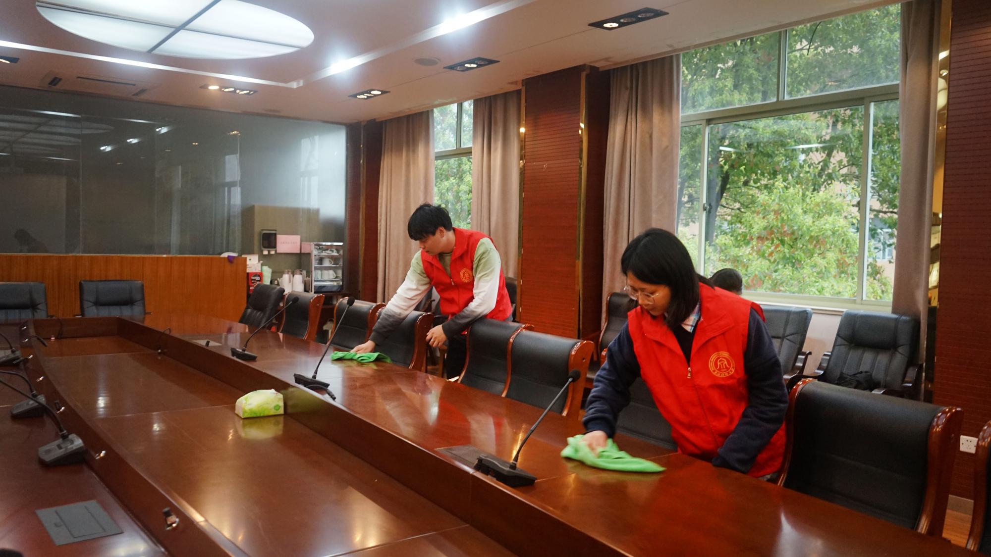 实践教育环节,新发展党员穿上了红鹄党员志愿者服,以饱满的精神和认真的态度,分组前往学院楼各教室开展新党员志愿服务活动。新党员们分工协作,耐心擦拭门窗、桌椅与储物柜,仔细地清扫灰尘,用自己的行动使党员形象体现在微小行动上,让青年党员的服务奉献精神和先锋模范精神在劳动中发光发热。