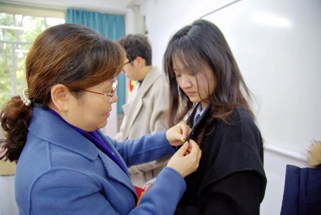 宣誓结束后,童玉玲书记为各支部预备党员代表逐一佩戴党徽并发放《中国共产党章程》。