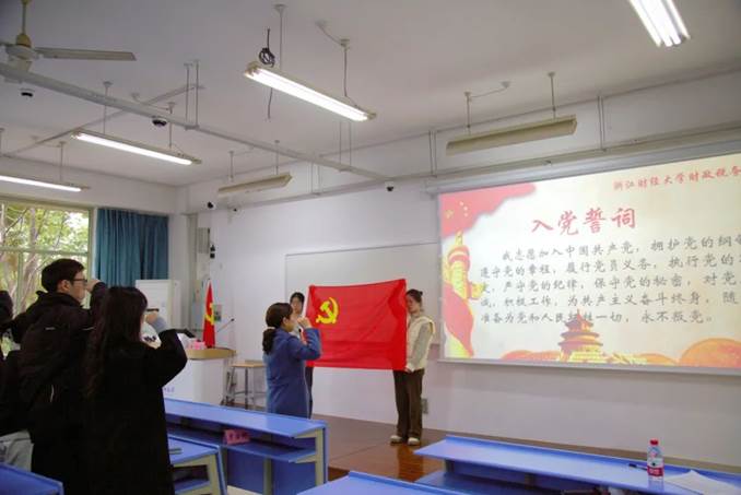党委组织全体新党员在教学楼B206教室开展新党员入党宣誓仪式。学院党委书记童玉玲、专职组织员胡卓文以及全体新党员参加本次仪式。