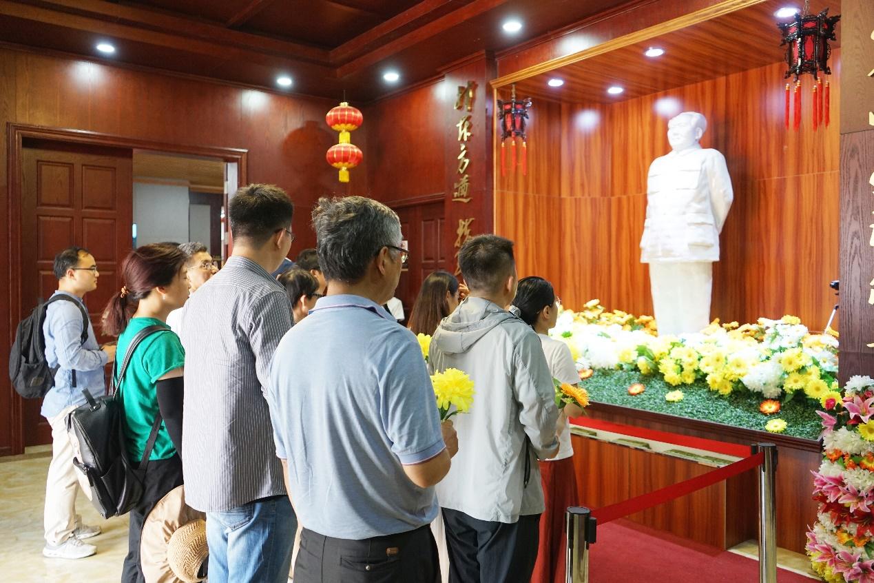 大家在毛主席像前庄严鞠躬,深情献花,缅怀先人。