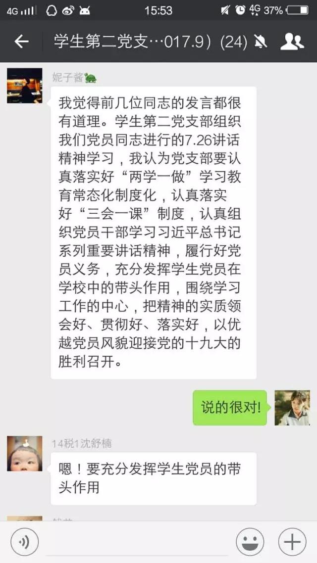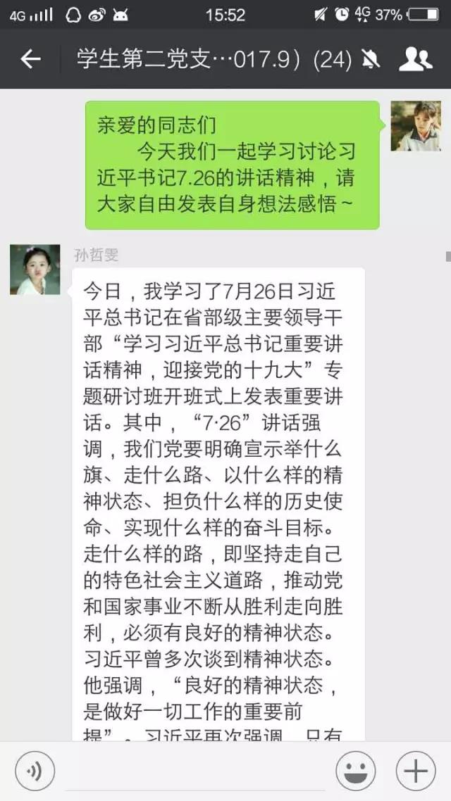 每位党员自行学习了习近平主席讲话内容与精神,线上线下都集中讨论了学习后的所感所悟。王卓萃同学认为:学习7.26习近平总书记讲话精神,收益最深的还是更加明确了党的态度和社会主义建设的信心决心。当年一句“撸起袖子加油干”,振奋了全党和全国人民。其实办好中国的事情,关键在党,这是被中国近代以来的历史反复证明了的道理。