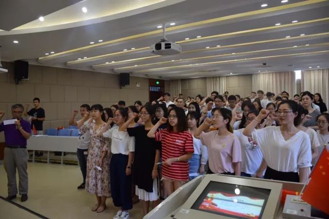教工第二党支部书记王绪强同志领读,全体师生党员伴随着《走向复兴》的激昂曲调,举起右拳,面向党旗,庄严宣誓。