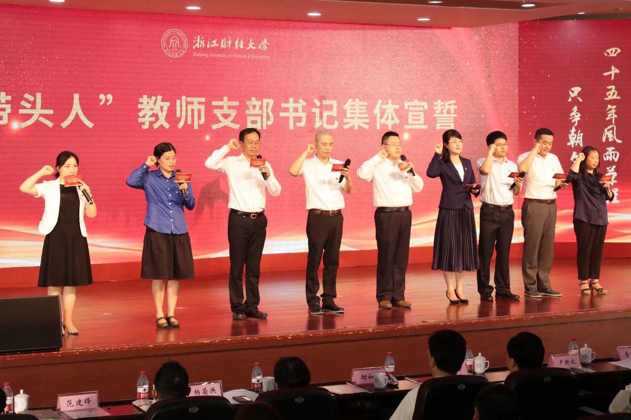 教工第一党支部书记童幼雏带领全体“双带头人”教师党支部书记宣誓,并由校党委书记李金昌授予“双带头人”教师党支部书记示范工作室牌。