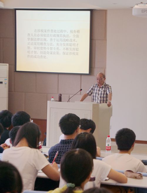 2012级税务专业学生作了题为《税务稽查谋略与实战》的讲座。此次讲座是我校“基地精英进课堂”系列活动之一,也是《纳税检查》课程课堂教学改革的一次尝试。