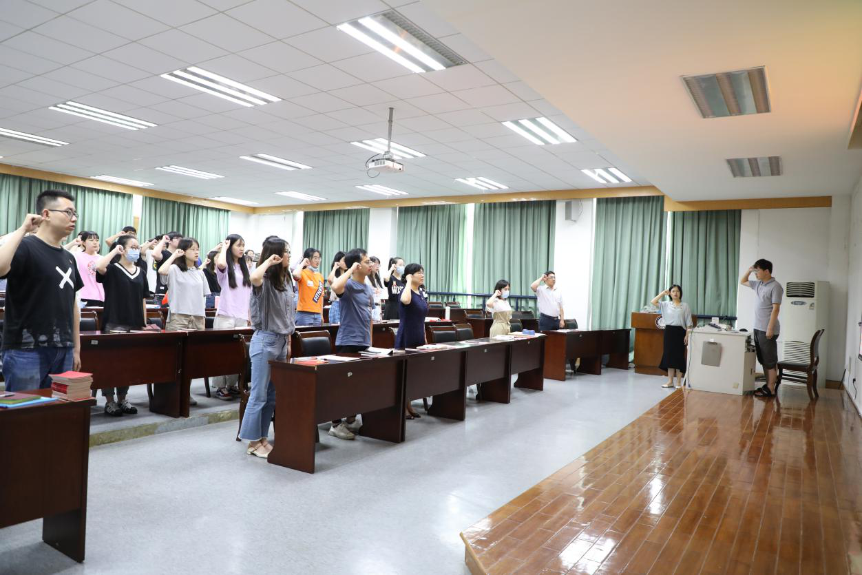 宣誓仪式后,学院领导和各支部书记为新发展党员佩戴党徽,逐一分发《中国共产党章程》和《中国共产党纪律处分条例》。