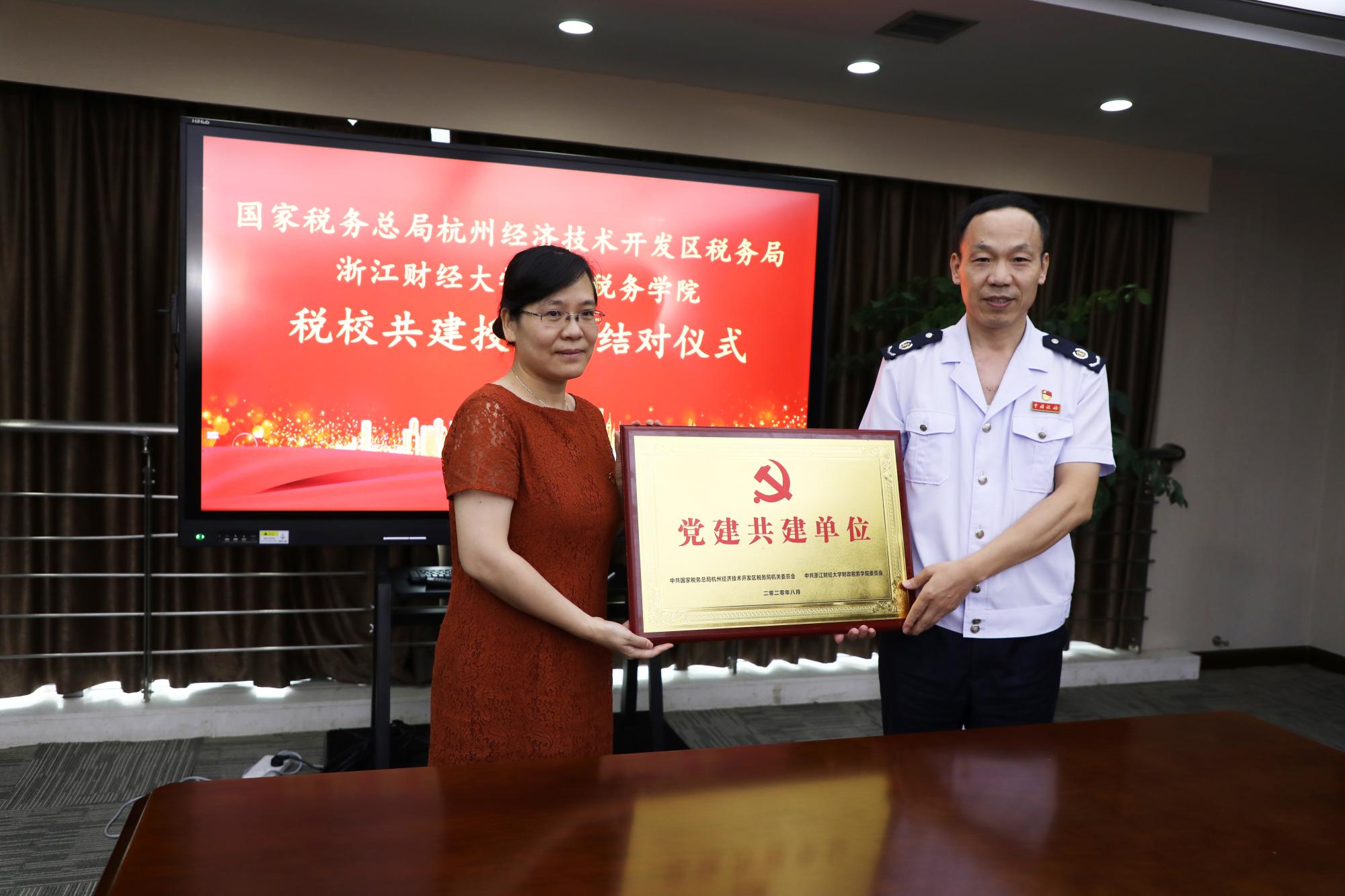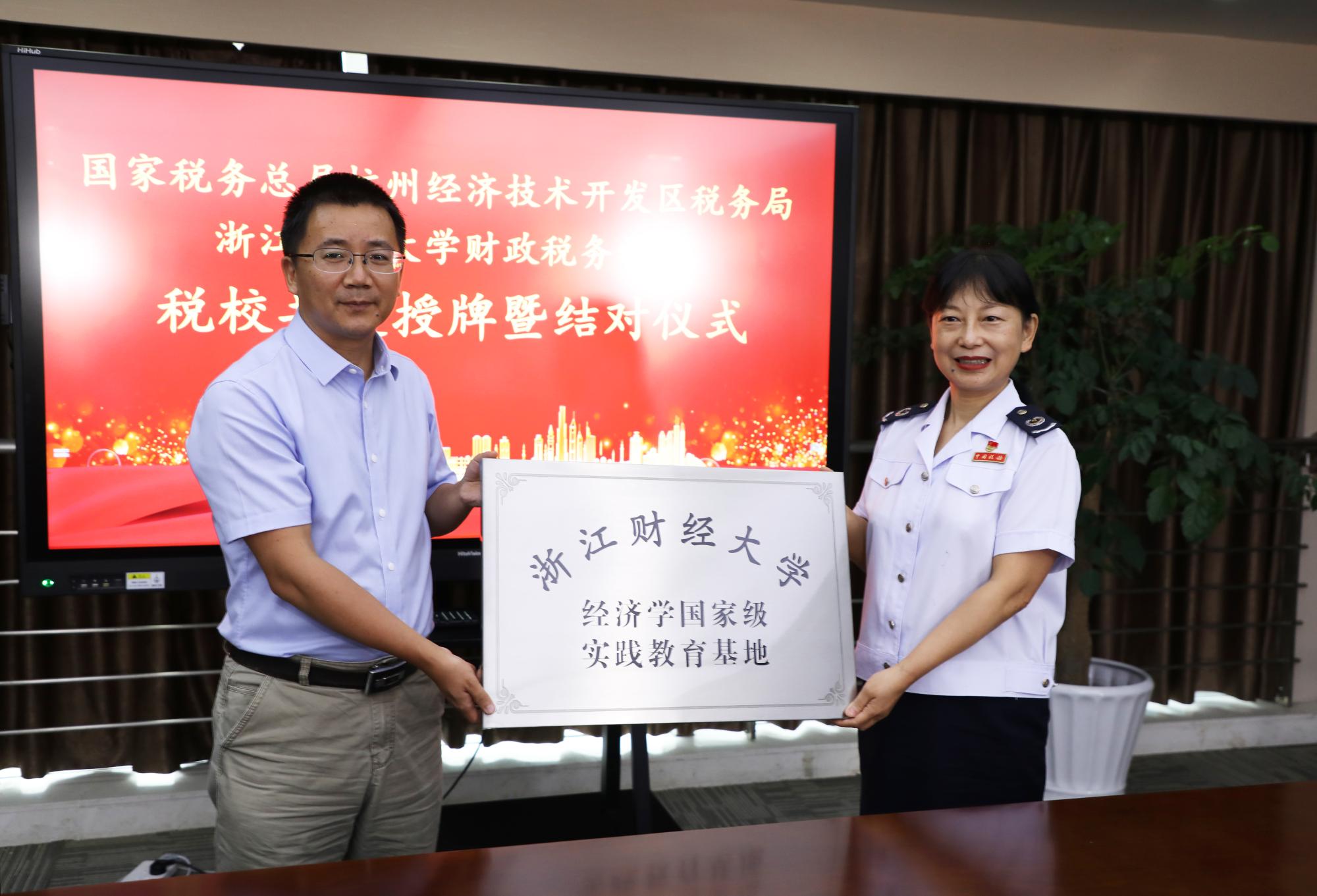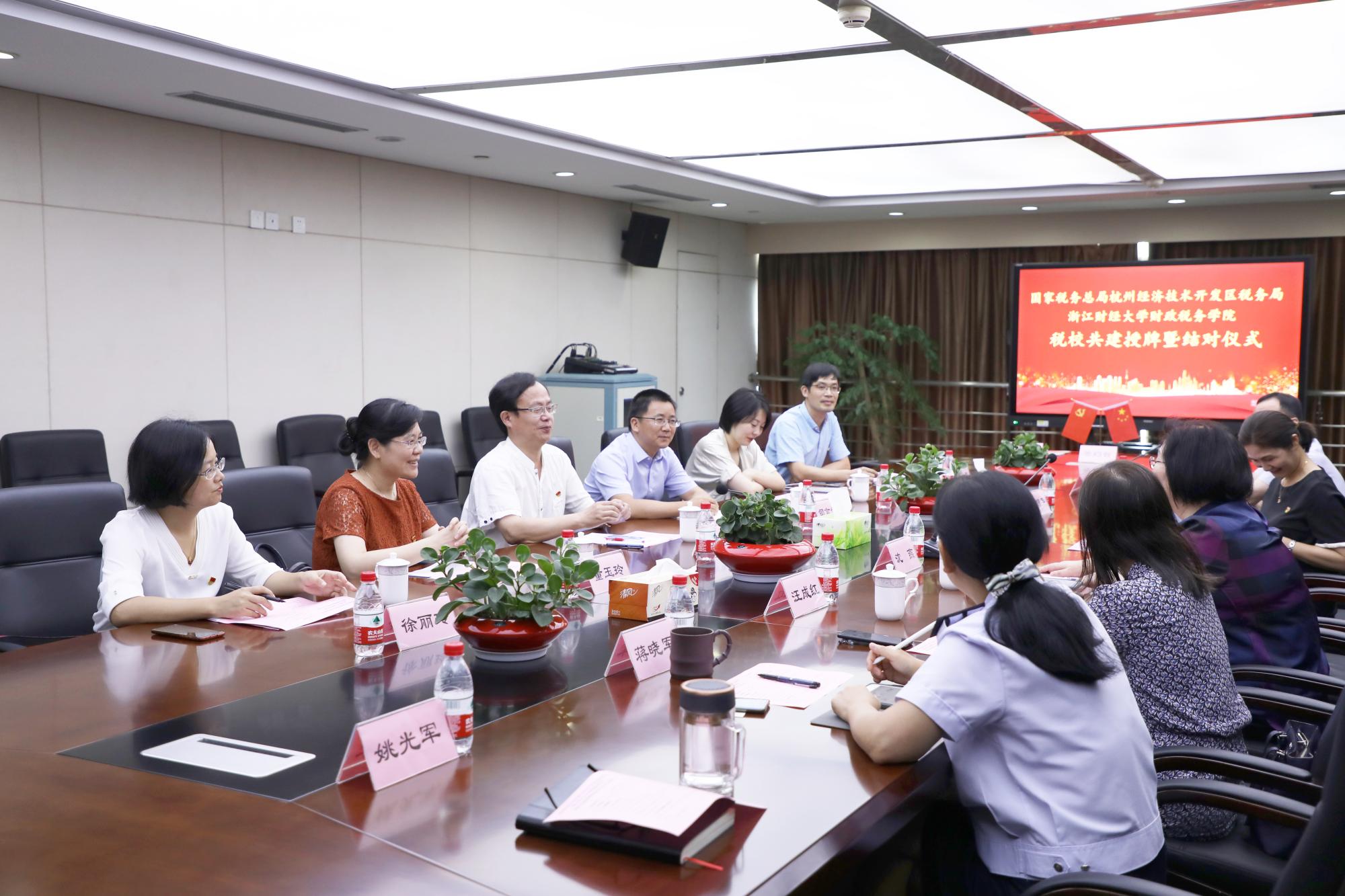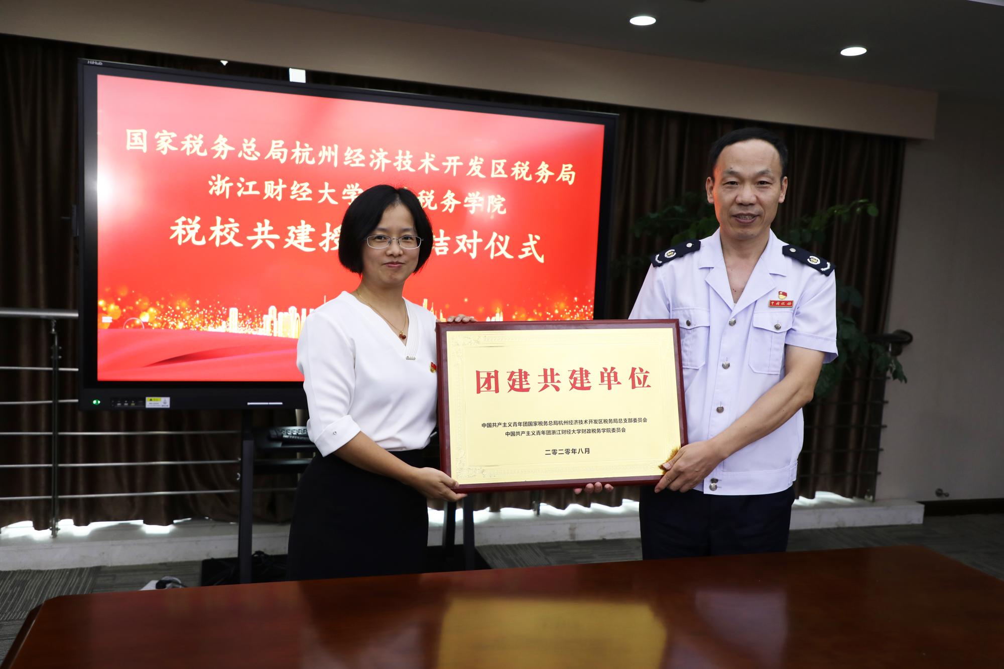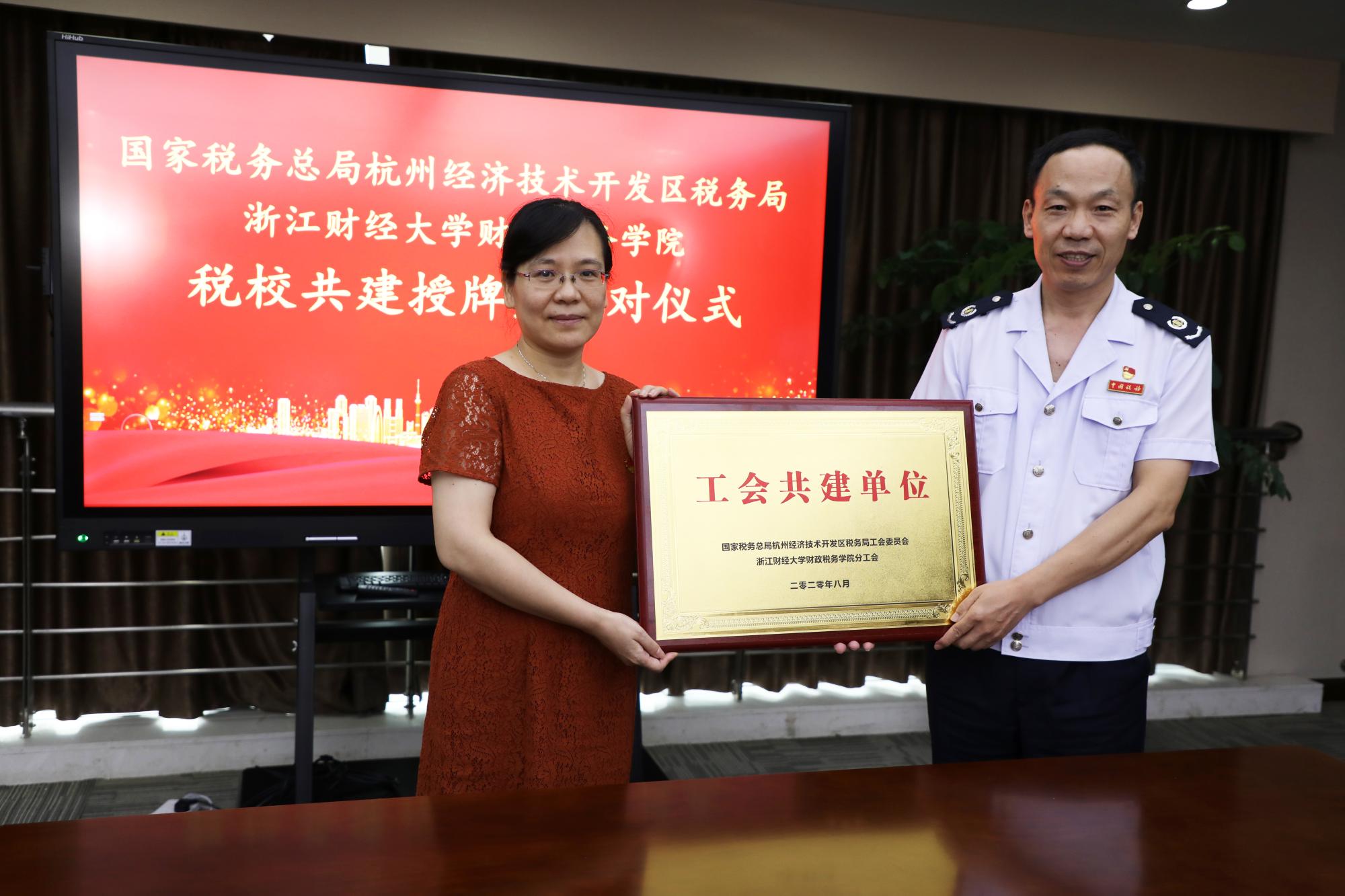 与杭州经济技术开发区税务局举行税校共建授牌暨结对仪式。校党委副书记黄建新,杭州市税务局党委委员、总经济师沈燕,杭州市税务局系统党建工作处(党委宣传处)处长汪成红,钱塘新区管委会党群工作部(组织部)副部长、机关党委专职副书记施正森,钱塘新区管委会妇工委副主任徐伟英等出席授牌结对仪式。