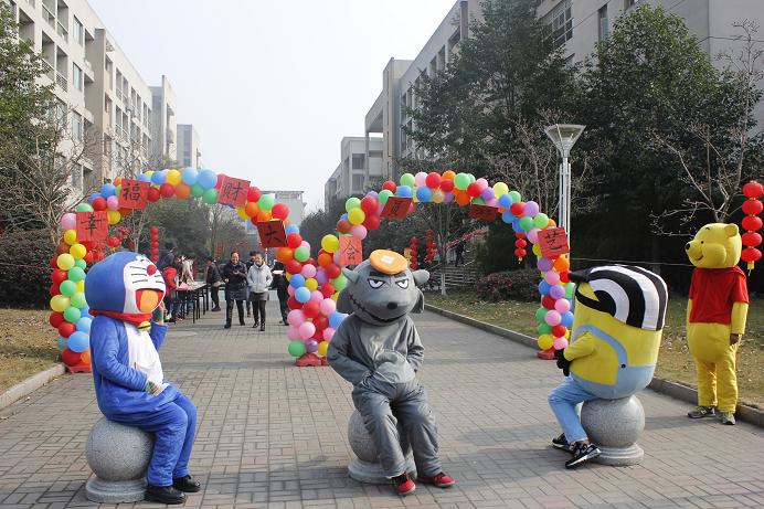 精心布置的气球拱门,上面标有“幸福财大,会员游艺”的活动主题。学院楼的出入口分别用红辣椒和红灯笼进行装饰,并在过道处悬挂了一个中国结,节日气氛浓烈,同时也寄予了av大平台
