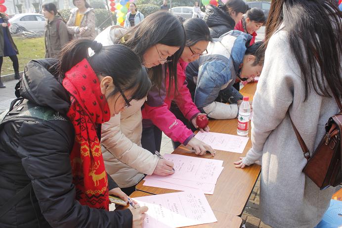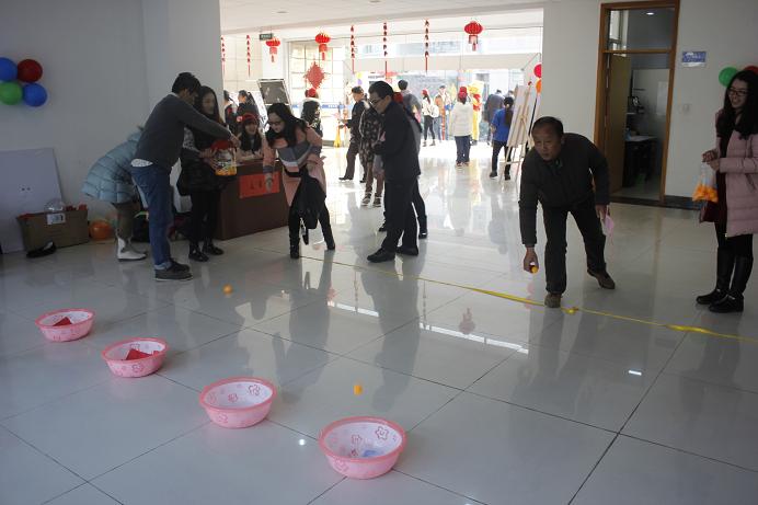 的游戏场地设定在电梯西边的空地及106教室。教职工们积极参加“快到碗里来”的小游戏,即掷出乒乓球沿途弹地多次后扔进脸盆内者获胜。一时未轮到游戏的老师均跃跃欲试,希望能在射手榜上签名纪念。会场内人潮涌动,大家三五成群地聚在一起,互相问候,送上新年的祝福,一派欢乐祥和的气氛。