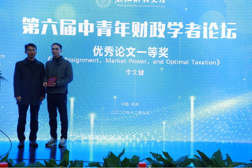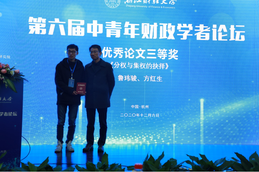 院长司言武教授对本届论坛取得圆满成功表示祝贺,并再次感谢各位专家学者的积极参与,他期望各位中青年学者为新时代财政发展添砖加瓦。本届论坛共评选出三篇优秀论文:中南财经政法大学李文健的《Job Assignment, Market Power, and Optimal Taxation》获一等奖,复旦大学刘志阔、袁从帅共同完成的《税制改革、营商环境与市场活力》获二等奖,浙江大学鲁玮骏、方红生共同完成的《分权与集权的抉择》获三等奖。李永友副校长为获奖者颁发获奖证书。