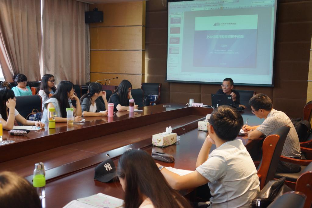 讲座中,王老师说明了公司并购重组的背景、内涵和若干问题,认为并购是企业发展到一定阶段的必然趋势,并介绍了有关上市公司并购重组的法律法规,主张依靠简政放权和完善税收的政策来引导资源通过并购重组进行重新配置,同时剖析了上市公司重大资产重组若干问题。王老师指出,作为税务硕士,应准确掌握基础专业知识,同时还要对资本市场、法律法规等方面有所涉猎,打破学科自身限制,形成系统的知识框架。