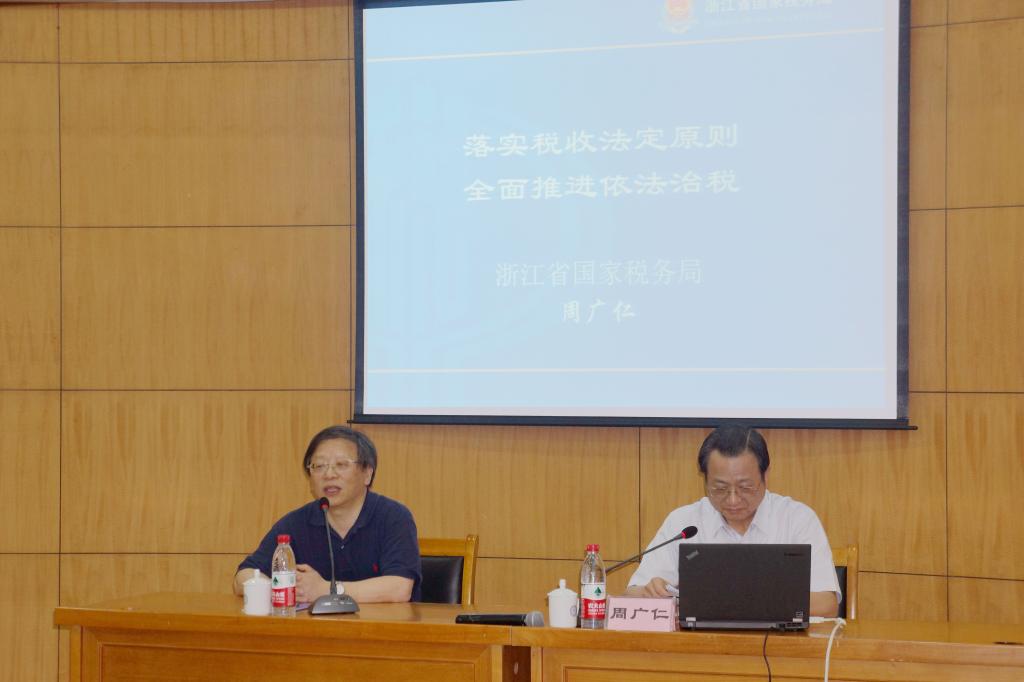浙江省国税局局长周广仁等七位财税部门领导、知名会计师和税务师事务所合作人应邀作了关于税收征纳、税收债券、投融资税收等最新税收政策趋势的讲座。讲座分别由财政与公共管理学院院长沈玉平、税务专硕项目负责人董根泰主持,全体税务专业硕士和部分校内硕导一起聆听了本系列讲座。讲座中,专家们结合工作中的大量案例,剖析了税制改革的最新动态,对趋势政策进行了简要分析,说明了“营改增”后企业如何防税务风险并结合丰富的实际案例对政策进行解读;介绍了企业破产清算程序中税收债权的分类以及企业破产清算程序中税收债权的申报等问题;或者从大数据时代对税务机关、纳税人和税务师事务所三个方面的影响着手,从企业所得税新纳税申报表主要变化切入,讲述了新旧企业所得税申报表的差异性。内容丰富多彩,授课深入浅出。