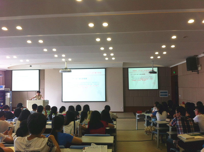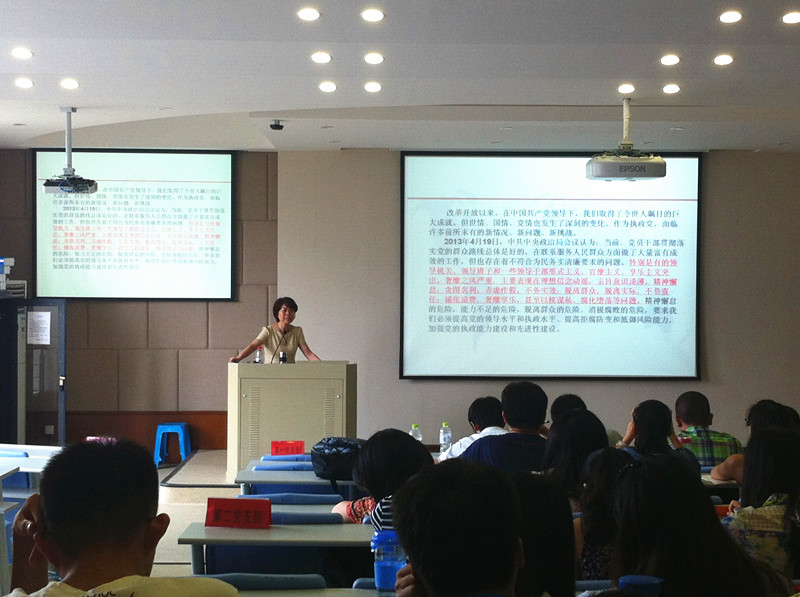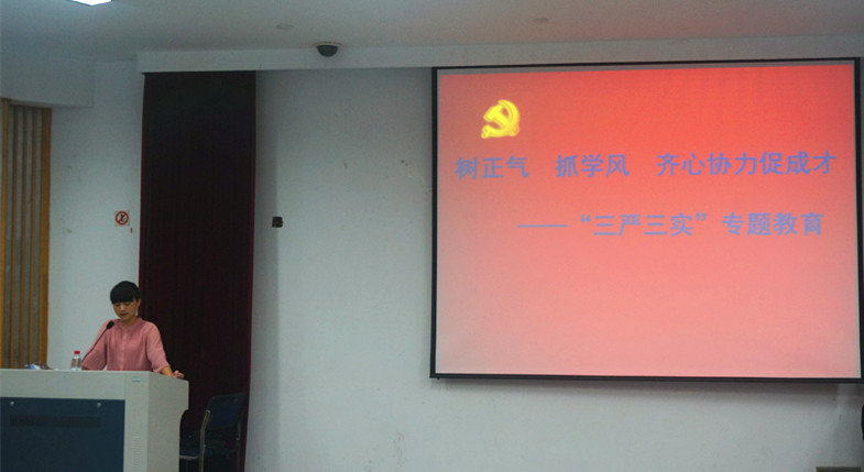 老师则总结了党的近期工作目标,并提出了“三严三实”专题教育的重要性与必要性。两位老师都分别介绍了“三严三实”的提出时间与内容,并针对内容进行了详细阐述。两位老师强调了“三严三实”专题教育的意义,并希望同学们要努力践行“三严三实”相关精神,锤炼党性,敢于担当,勇于表率。