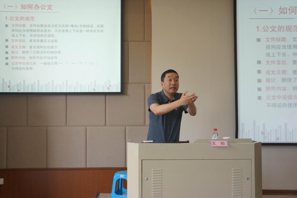 老师从如何办公文、如何写材料两个方面着手,以常用公文写作为例,结合自身的经验和学员们分享了一些规范和写作技巧;接着,我校思政部的