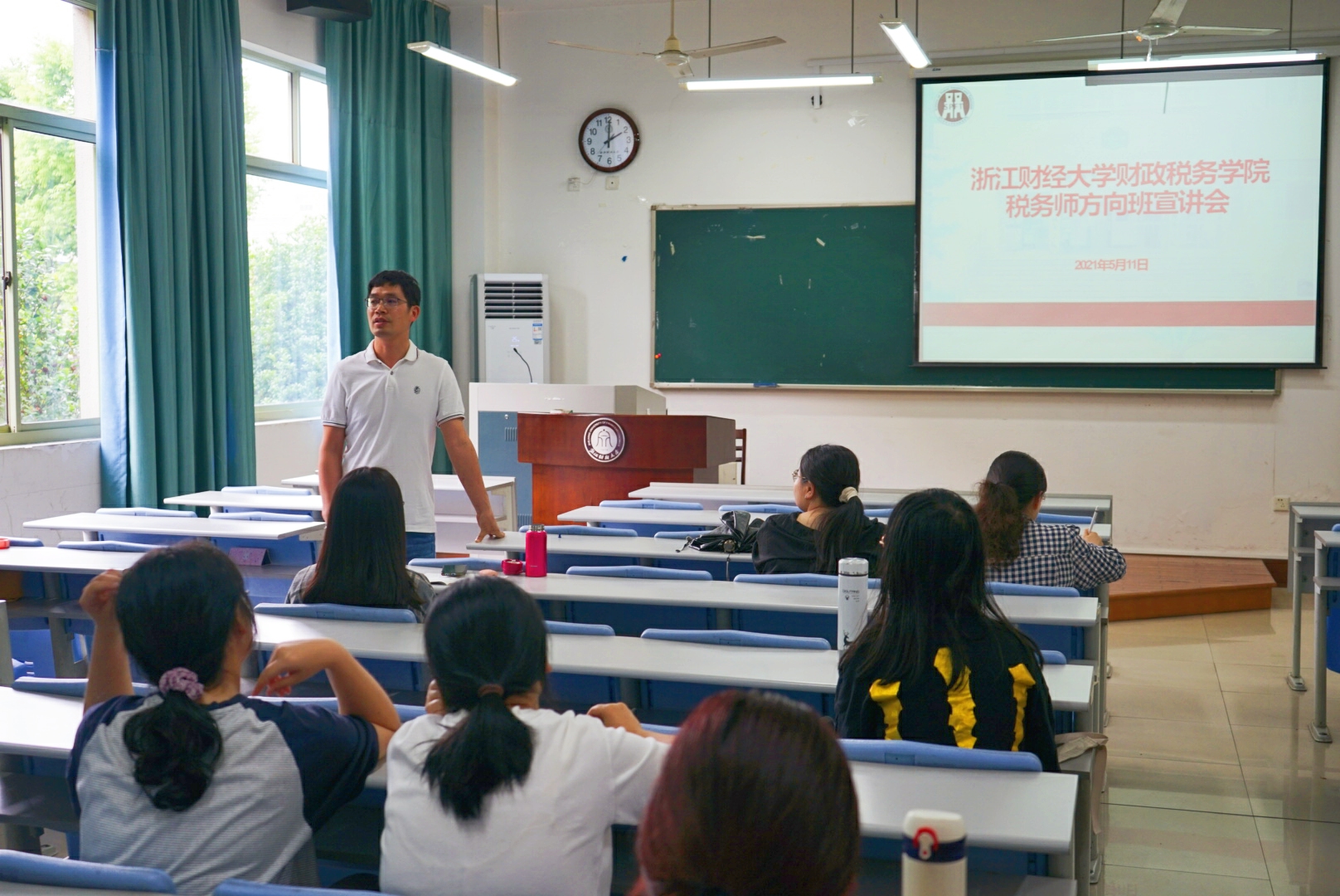 宣讲会伊始,张帆从税务师班的成立渊源、培养目标、课程构成三个角度详细说明了本班的具体情况。他指出“税务师方向班”将着重强化同学们对于税收实务等相关专业知识的掌握,锻炼提升实务操作能力,为社会培养与行业要求相接轨、日后有志于从事涉税服务及相关工作的应用型人才。税务师方向班是浙江省注册税务师协会与av大平台