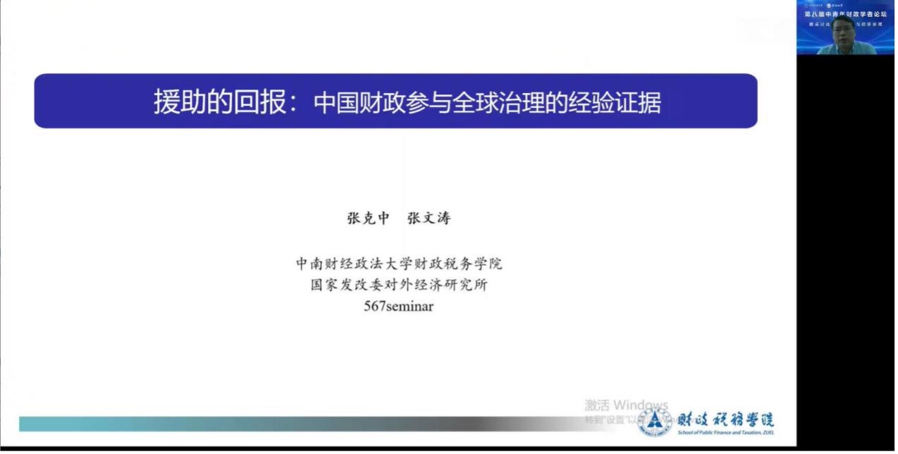 张克中教授的发言题目是“援助的回报:中国财政参与全球治理的经验证据”。他从援助回报的新视角分析了对外财政援助的益处,研究发现,中国的财政援助通过建立良好国家形象促进了出口和投资,并且有助于提高国家政治议价能力。