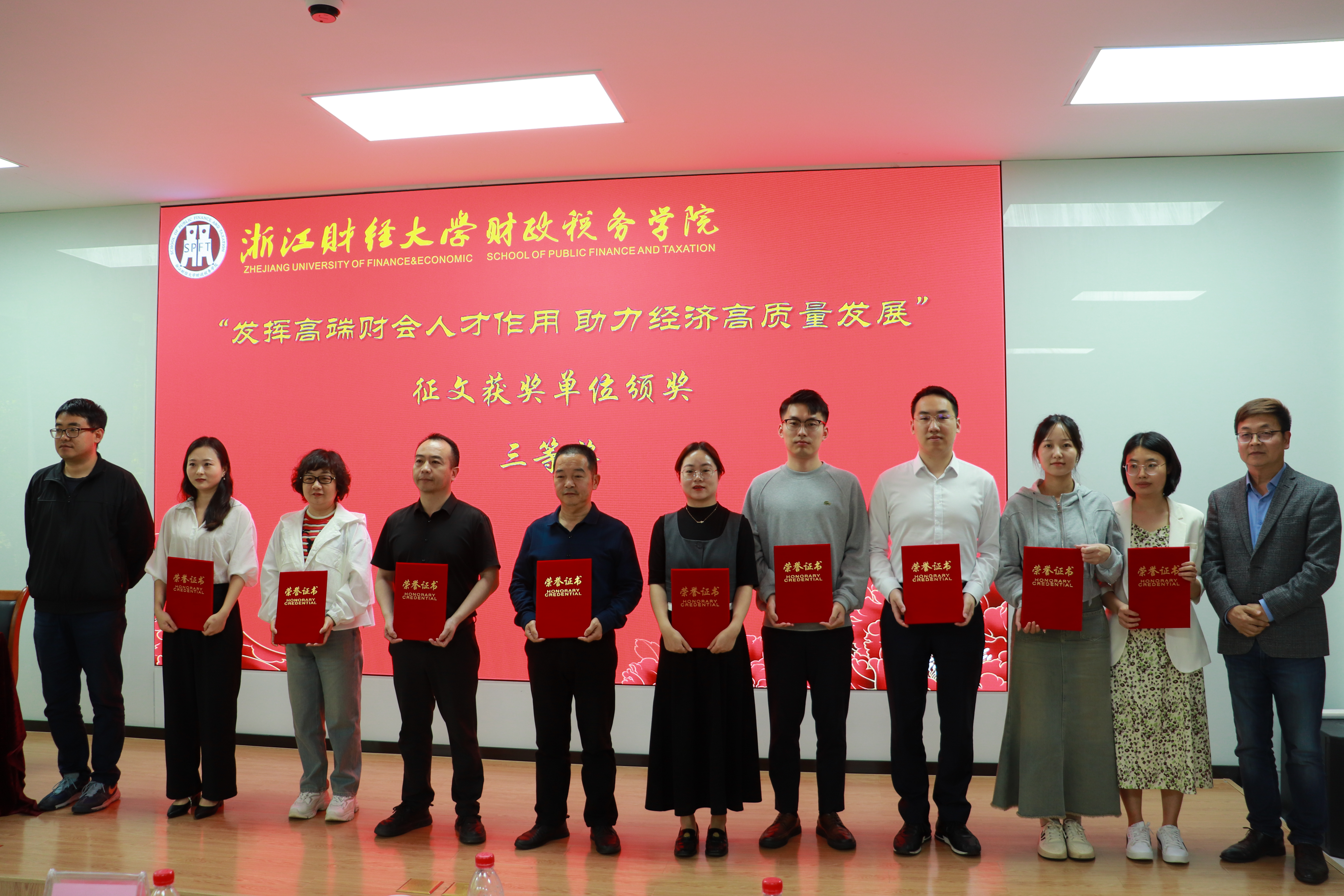 向浙江省总会计师协会对此次活动的大力支持表示由衷的感谢。随后举行了征文获奖单位颁奖仪式,俞乐平女士和付文林院长作为颁奖嘉宾为一等奖获得者颁奖,学院教师董根泰、黄冠豪和蒲龙为二等奖、三等奖获得者颁奖,颁奖仪式结束后所有与会嘉宾移步至学院楼正门合影留念。
