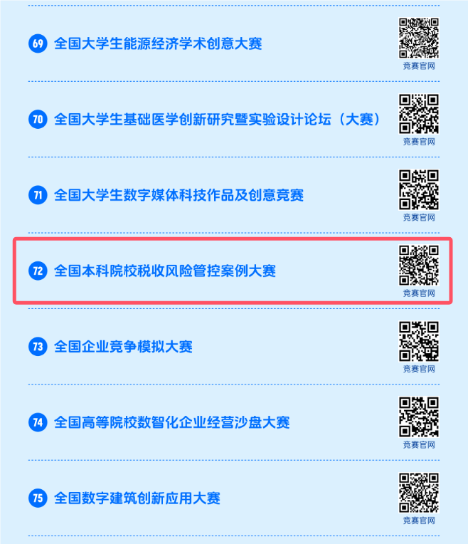 经过多年的发展,全国大学生学科竞赛体系日臻完善,竞赛项目数量不断增加,参赛规模持续扩大,影响力也日益提升。为规范大学生竞赛活动,2023年教育部又发布了《2022全国普通高校大学生竞赛分析报告》,将84项赛事列入竞赛清单,全国本科院校税收风险管控案例大赛位列其中。该竞赛清单是教育部发布的大学生竞赛榜单,含金量超高!