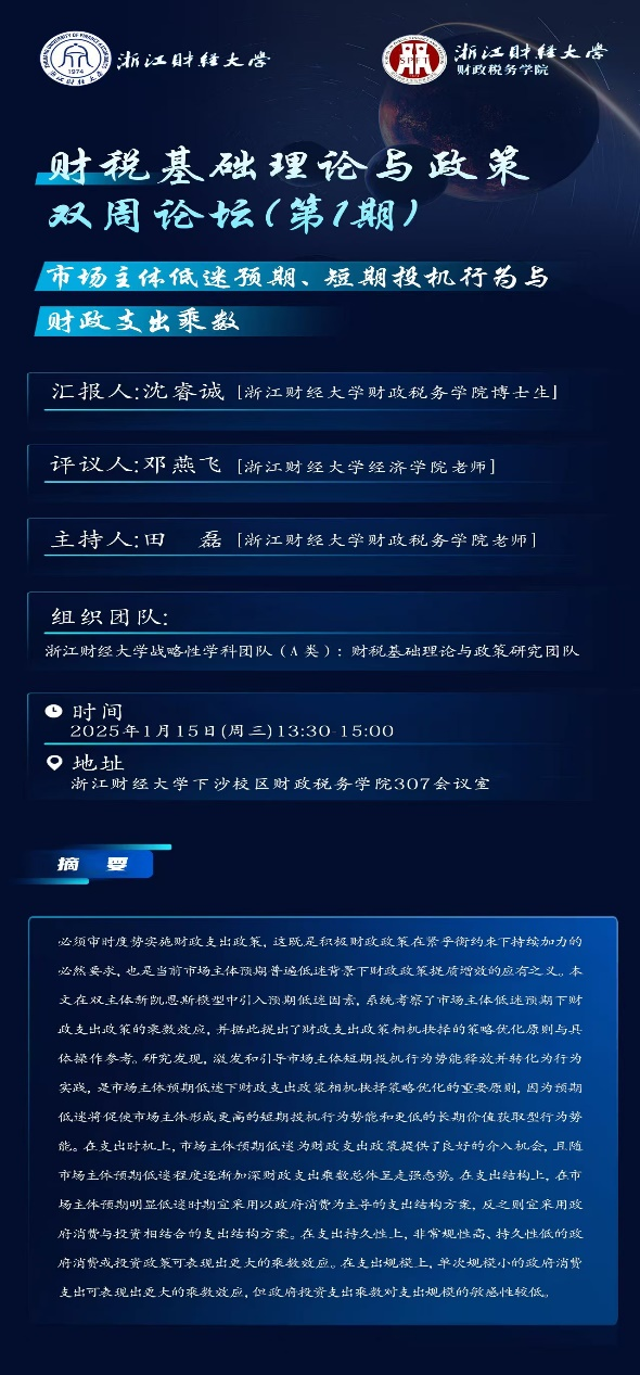A类战略团队“财税基础理论与政策”在财税学院举行第一期双周论坛。本次论坛汇报人,财税学院博生生沈睿诚分享了题为“市场主体低迷预期、短期投机行为与财政支出乘数”的工作论文,经济学院邓燕飞老师对论文进行了点评。论坛由战略团队成员田磊主持,团队成员王超、吴超,av大平台
