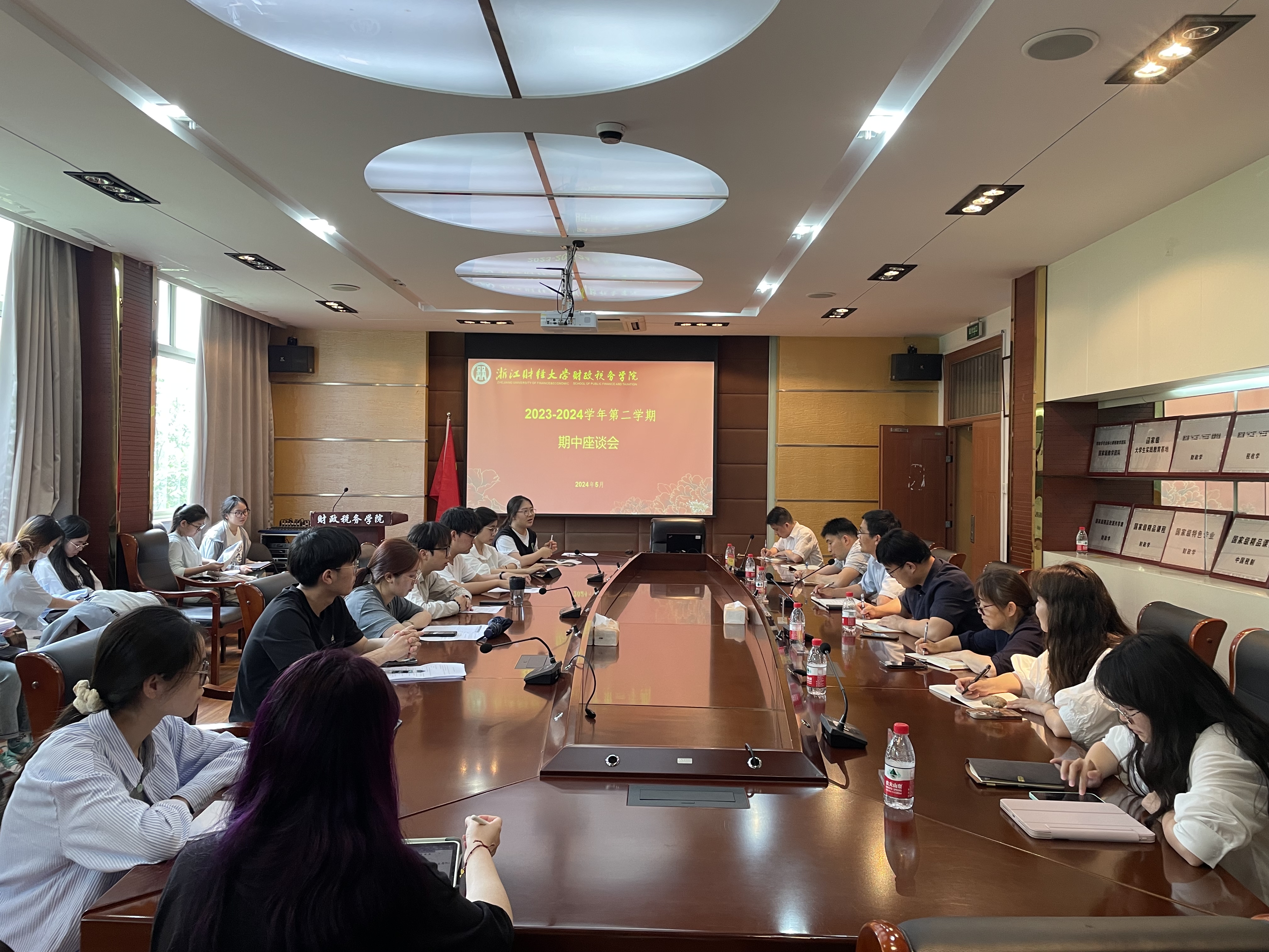 在学院楼307会议室召开了本科生期中教学座谈会,本次会议由教学副院长张帆主持。财政系主任鲁建坤,税务系主任田磊,本科教学督导组组长骆勤,教学秘书,辅导员出席,全体教学信息员参加会议。