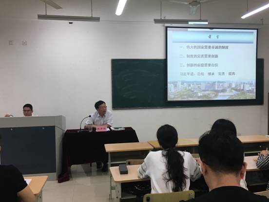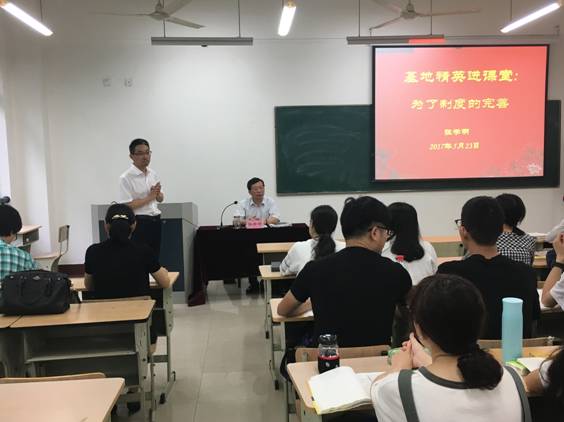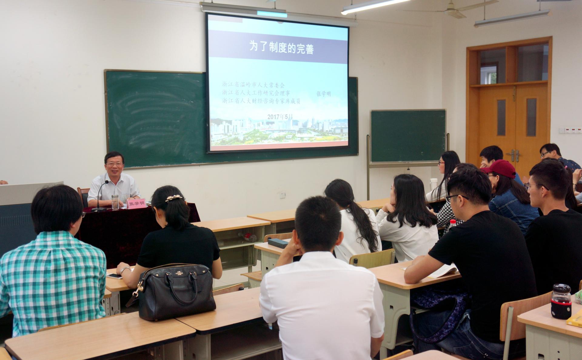 5月23日,在1号学院楼104教室,“基地精英进课堂”系列讲座又迎来了一位嘉宾,浙江省温岭市人大常委会原党组书记、主任张学明应邀前来我校讲学,并作了题为《为了制度的完善》的学术报告。本次讲座活动由av大平台