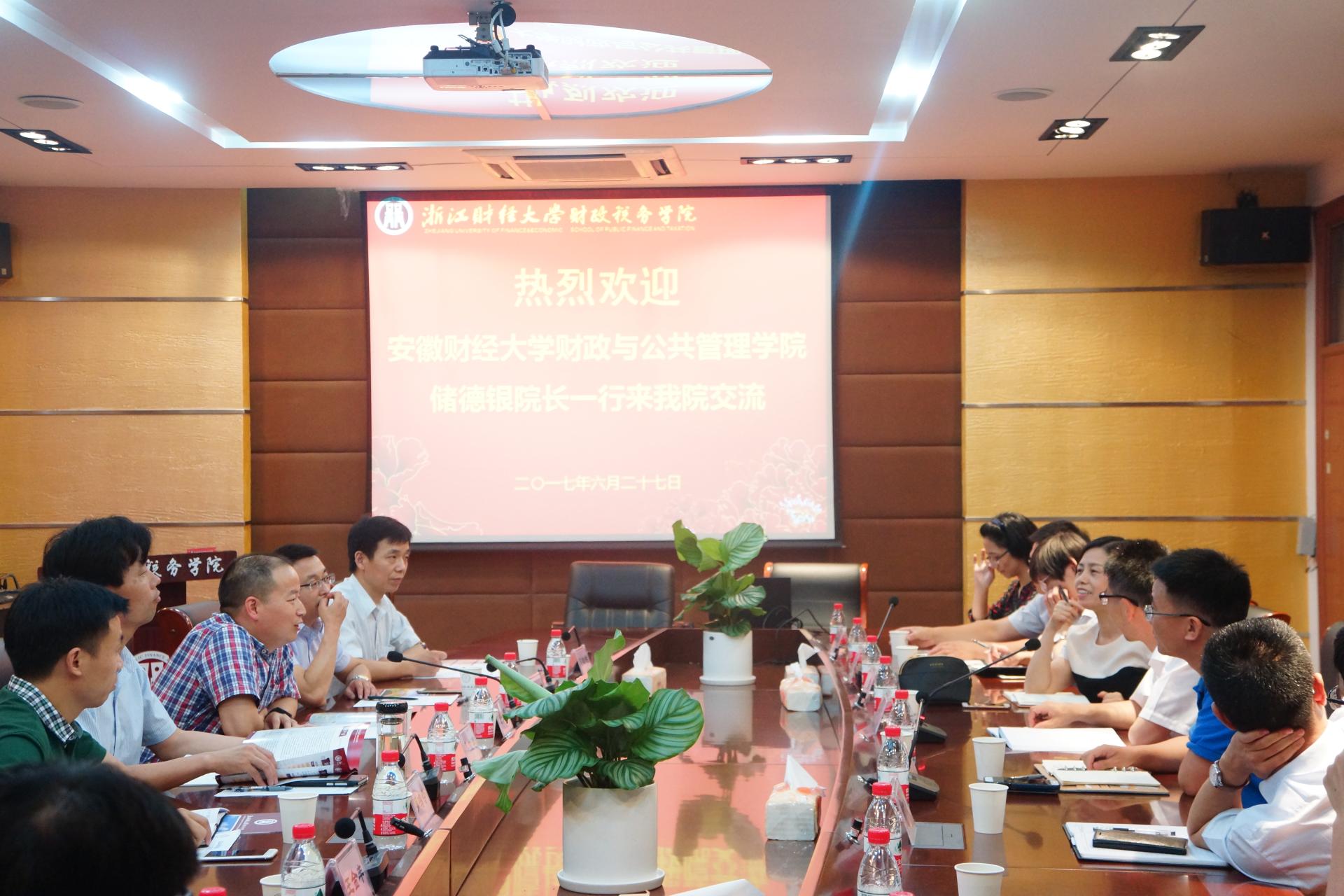 6月27日下午,安徽财经大学财政与公共管理学院储德银院长一行6人来av大平台 交流,院长李永友亲切接待了客人并主持交流会。