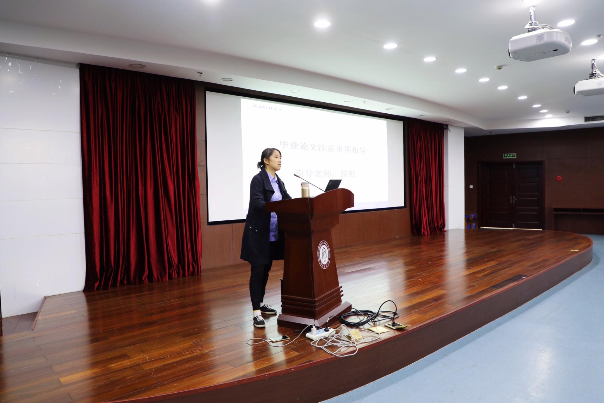 接着,司言武副院长就毕业论文的相关事宜做了详细说明,着重强调了毕业论文和毕业实习在毕业过程中的重要性。他从毕业论文的流程、选题、开题报告和答辩四个方面展开介绍。他建议同学们选题与专业密切相关,角度要小,做到“小题大做”。他以历年学生的选题举例说明,列举了许多参考文献使在座同学对选题更为明确。关于毕业实习,司老师提出了具体要求与自己的看法。他主张同学们去专业相关的单位实习,而且实习内容应该为本专业所学习的知识技能。