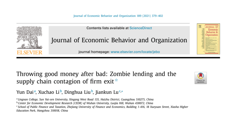 副教授鲁建坤,与中山大学岭南学院戴芸副教授、武汉大学经管学院李旭超副教授以及博士生刘丁华合作的论文《Throwing good money after bad: Zombie lending and the supply chain contagion of firm exit》在经济学国际顶尖学术期刊《Journal of Economic Behaviorand Organization》发表。
