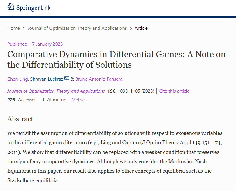 凌晨教授、Shravan Luckraz教授和意大利雷焦卡拉布利亚地中海大学Bruno A. Pansera教授合作的论文《Comparative Dynamics in Differential Games: A Not on the Differentiability of Solutions》在Journal of Optimization Theory and Applications(JOTA)期刊正式发表。JOTA是微分博弈领域的主要期刊,非零和微分博弈理论诞生于该期刊。