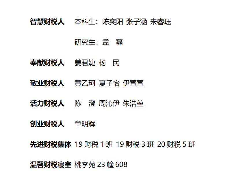 为充分发挥学生群体的青年榜样力量,进一步提升学院的良好学风,根据《av大平台 “财税鸣笛人”评选标准细则》,本次“财税鸣笛人”评选活动,经学生自主申请、学院初评,结合学生申请材料、答辩现场表现及平时表现,经学院评审会讨论,最终确定陈奕阳等17名同学(或集体)获得第五届“财税鸣笛人”荣誉称号,具体名单如下: