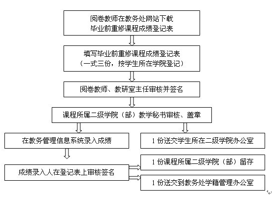 2、请各阅卷教师于5月14日前将毕业前重修成绩(一式三份)交课程所在二级学院(部)办公室。