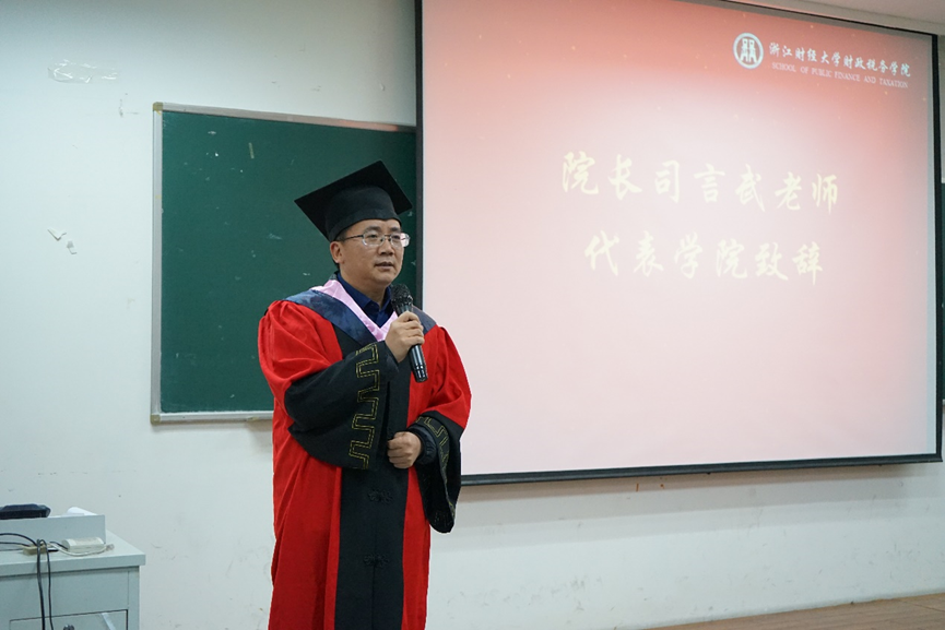 随后,司言武代替学院致辞。他强调,财税学院享有“浙江省财税干部的摇篮”的美誉,是一个优秀的人才培育地,希望大家怀揣着入校时的热忱,坚守初心,走向社会,并祝愿同学们前程似锦。