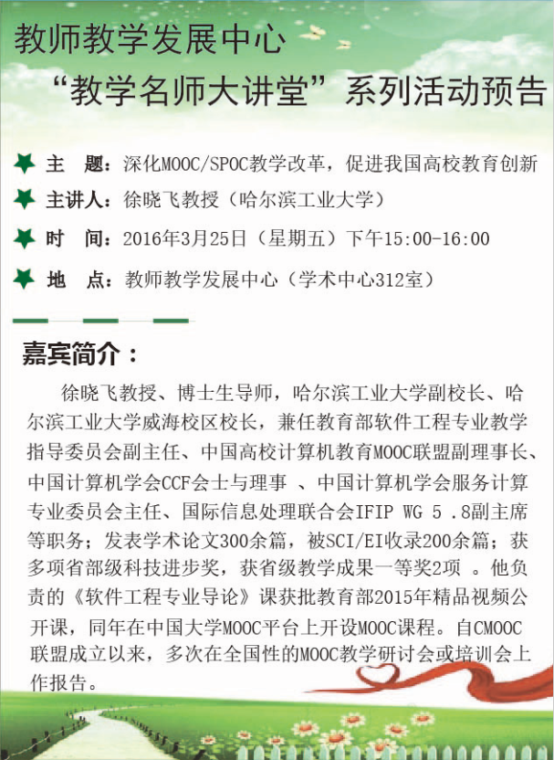 参会人员:学院(部)分管教学领导、校级及以上精品开放课程建设项目负责人及团队成员,以及其他感兴趣的教师。